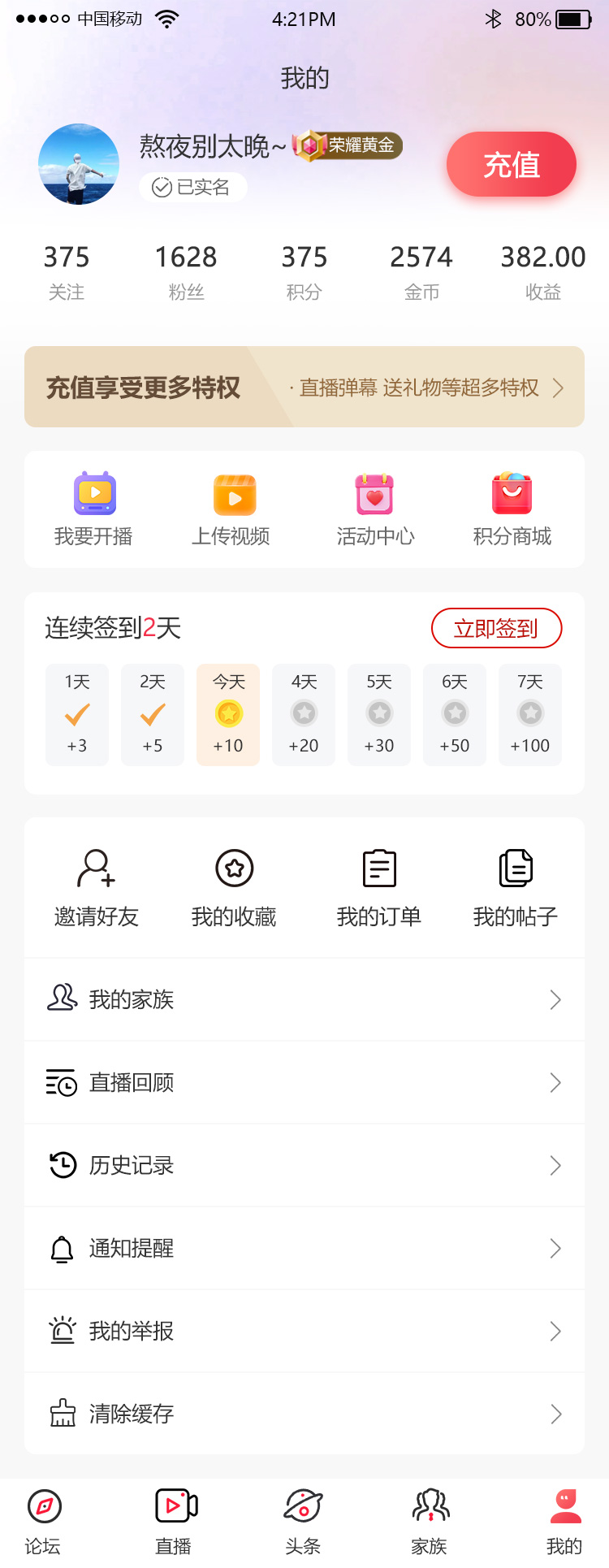 包含個人基礎資料、消息通知提醒、瀏覽歷史查看、開播入口、上傳視頻、簽到、邀請好友、收藏、帖子、訂單等等綜合性數(shù)據(jù)展示模塊。賬戶金幣、收益、積分與充值的記錄明細。積分商城的兌換記錄等等。