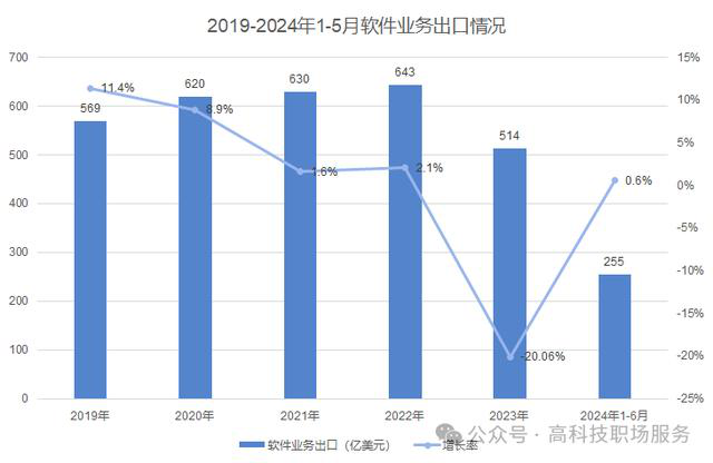 從出口額來(lái)看,自2019年以來(lái),我國(guó)軟件業(yè)務(wù)出口一直在穩(wěn)步上升,2022年達(dá)到峰值643億美元。但2023年出口額有所滑落,且下滑幅度較大,超20%,但2024年上半年的增長(zhǎng)率略有提升。