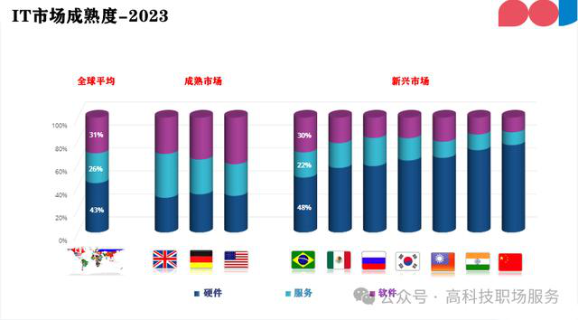 根據(jù)ABES Software的研究數(shù)據(jù),在全球市場(chǎng)中,硬件占據(jù)了43%的市場(chǎng)份額,軟件市場(chǎng)占31%,服務(wù)市場(chǎng)占26%,可見(jiàn)硬件和軟件仍然是IT市場(chǎng)的主要驅(qū)動(dòng)力。成熟市場(chǎng)的軟件與服務(wù)成熟度較高,三大市場(chǎng)相對(duì)均衡;而在新興市場(chǎng),尤其是中國(guó),軟件和服務(wù)的成熟度非常低,與硬件市場(chǎng)有較大差距。