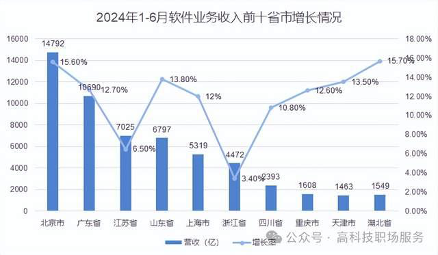 2024年上半年我國(guó)軟件業(yè)務(wù)收入增長(zhǎng)前十省市增長(zhǎng)情況如下:收入最高的前三省市分別是北京市、廣東省、江蘇省,其中北京和廣東均超萬(wàn)億;從增長(zhǎng)率來(lái)看,所有省市軟件業(yè)務(wù)收入都在增長(zhǎng),其中有8個(gè)省市增長(zhǎng)率在10%以上,最高的是湖北省,達(dá)15.7%。