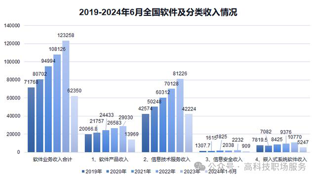 從軟件分類(lèi)收入來(lái)看,從2019年到2023年,我國(guó)軟件業(yè)務(wù)的各個(gè)板塊的收入都在穩(wěn)定增長(zhǎng)。其中信息技術(shù)服務(wù)板塊收入占比最高,且增速最快;信息安全收入占比最低。