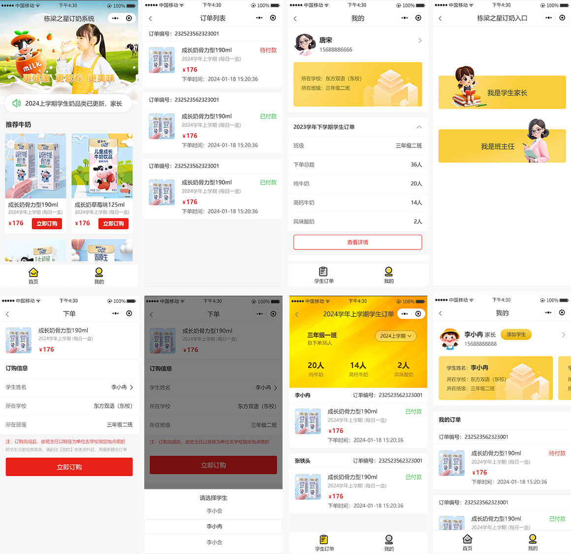 本系統(tǒng)專門為學(xué)校的學(xué)生統(tǒng)一訂奶使用,分為:家長(zhǎng)端、班主任老師端、總后臺(tái)管理端。  學(xué)生每學(xué)期訂奶一次,家長(zhǎng)注冊(cè)給孩子訂奶,班主任可以查看自己班級(jí)的訂奶人數(shù)、每種奶的訂奶數(shù)量以及哪些孩子訂奶了。后臺(tái)可以查看所有的訂單。可按學(xué)校、按班級(jí)篩選,導(dǎo)出表格,方便核對(duì)。家長(zhǎng)也可注冊(cè)添加多個(gè)孩子為其訂奶。每學(xué)期每個(gè)孩子只能訂奶一次,不可重復(fù)下單。